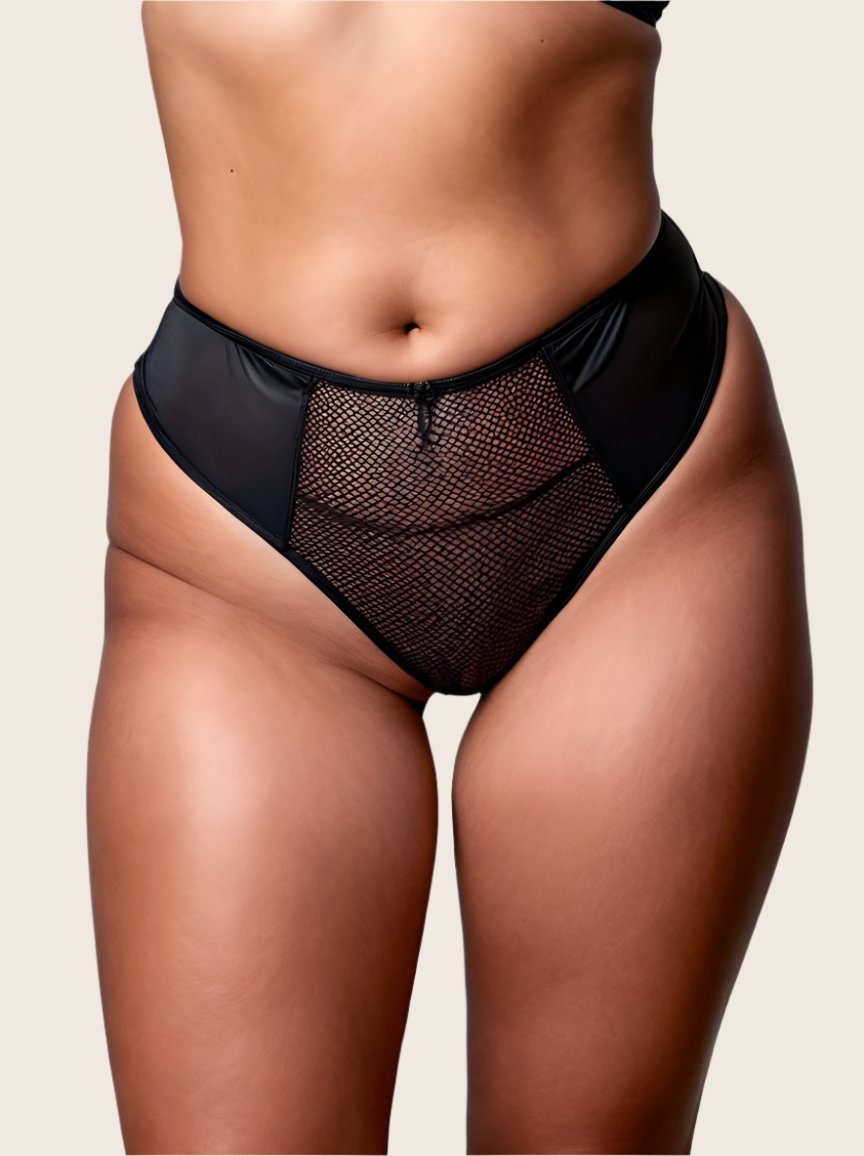 Embrace your inner temptress with the Tease knicker in Obsidian Black. This daring high-waisted crotchless brief combines wet-look sides with a barely-there sheer fishnet front, leaving little to the imagination. The open back ensures you’re unforgettable, while the easy slip-on design lets you answer desire whenever it strikes.